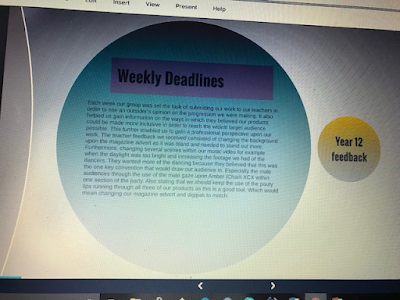 - * Gain feedback on your rough cut (music vid, digipack and magazine advert) from class, from Year 12, from friends, from parents, from teachers, from on line surveys